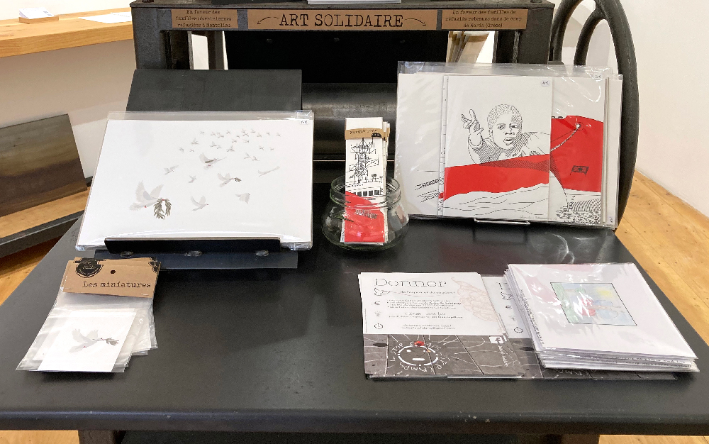 Retrouvez à l'atelier des œuvres à petit prix vendues au profit de l'association Butterfly solidarity qui aide les familles réfugiées dans le camp de Moria en Grèce, et des œuvres au profit des familles ukrainiennes réfugiées à Montolieu.